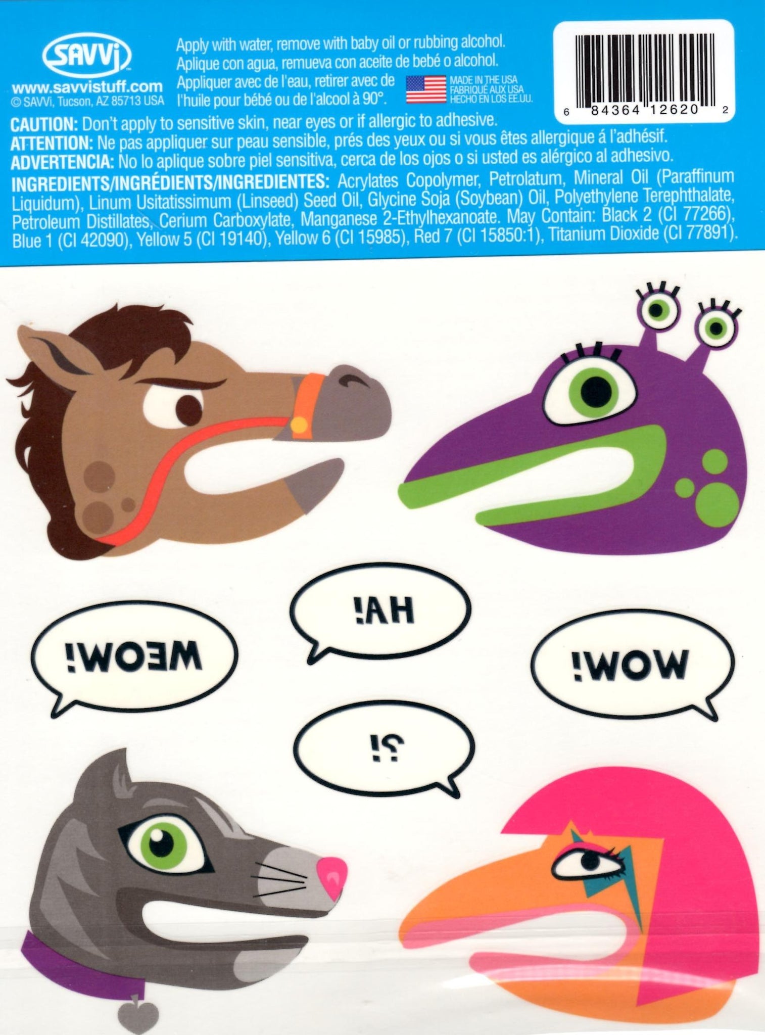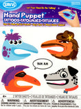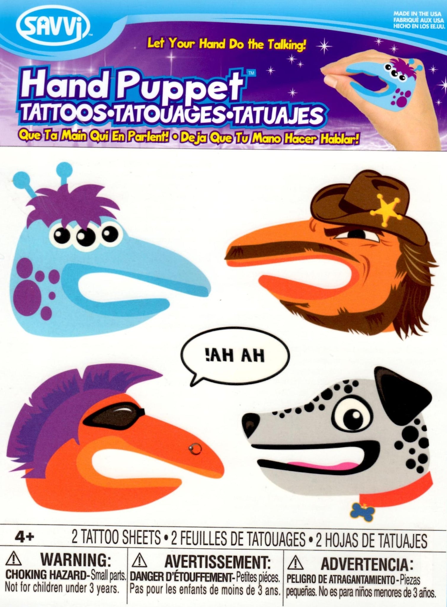 Pochette Savvi regroupant 2 planches de tatouages decalcomanies "Hand Puppet tattoos". Série de tattoos vraiment sympa pour les anniversaires. Faites parler vos mains et réalisez des spectacles de marionnettes !