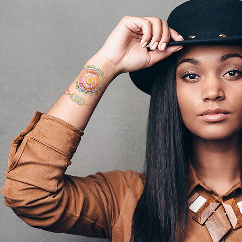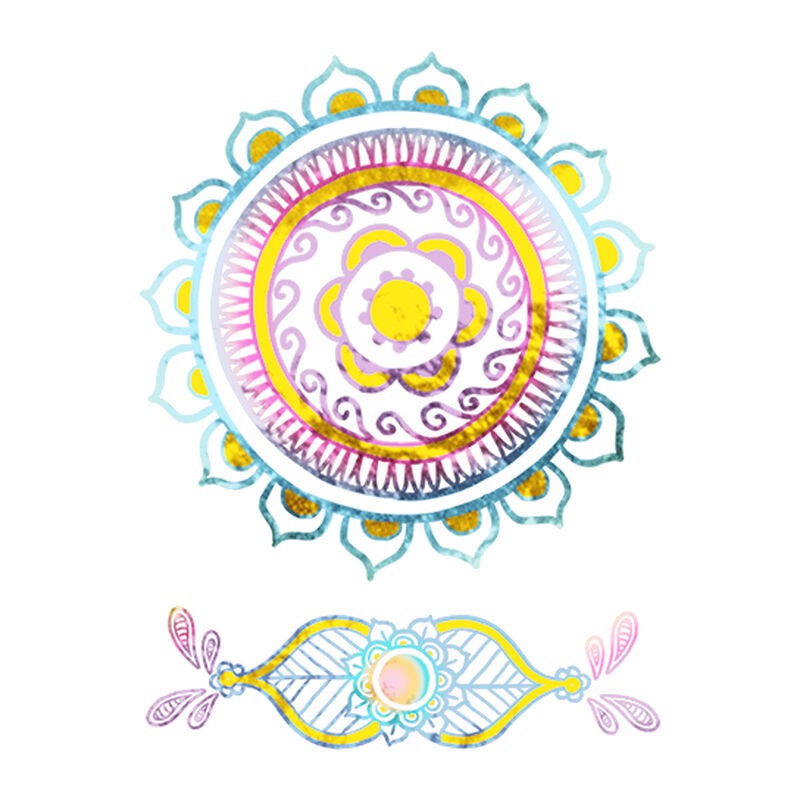 Craquez pour ce superbe tatouage coloré métallisé et brillez de mille feux à la plage comme en soirée. Ce mandala oriental semble tout droit inspirée des contes de 1001 nuits et n'est pas sans nous rappeller les motifs au henné du Magrheb.
