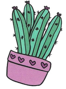 Tatouage décalcomanie représentant un cactus dessiné. C'est un cactus rigolo, posé dans son pot violet sur lequel des coeurs sont dessinés. Le tatouage cactus est exotique, il nous rappelle les forêts et les déserts qui sont son habitat naturel et évoque le mexicain qui fait la sieste sous son chapeau !